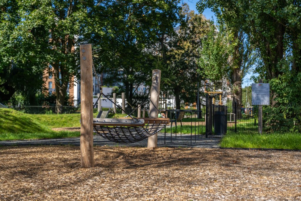 Całość została uzupełniona nasadzeniami drzew i krzewów, małą architekturą oraz ciągami pieszymi. Plac zabaw jest ogólnodostępny i otoczony bezpiecznym ogrodzeniem.